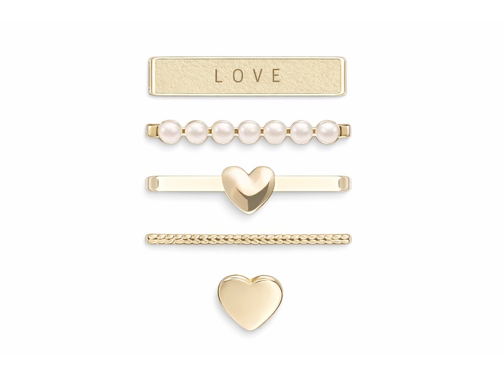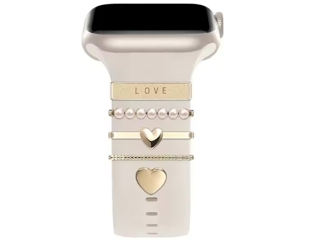 Adjon elegáns és romantikus hangulatot okosórájának ezzel a luxus óraszíj-ékszer szettel, finom arany kivitelben. A szett öt stílusos díszt tartalmaz, melyeket a szerelem szimbóluma ihletett – LOVE felirat, gyöngyök és szívek.