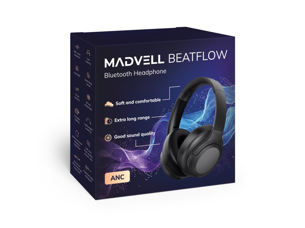 A stílusos Madvell Beatflow fejhallgató örömet okoz a nagyszerű zene szerelmeseinek. A fejhallgató mikrofonokkal rendelkezik, így kényelmes és zavartalan telefonálást tesz lehetővé, beleértve az ANC és ENC üzemmódokat is. A kezelőszervek a fejhallgató alján találhatók. Vezérlés a fejhallgatón: ANC be- és kikapcsolása, Számok közötti váltás, Hangerő beállítása, Hangsegéd (Siri vagy Google) előhívása. A fejhallgatóval elfogadhat vagy elutasíthat egy bejövő hívást. A fejhallgatók standard akkumulátor-üzemideje akár 39 óra is lehet, az ANC használatától és a zene hangerejétől függően.