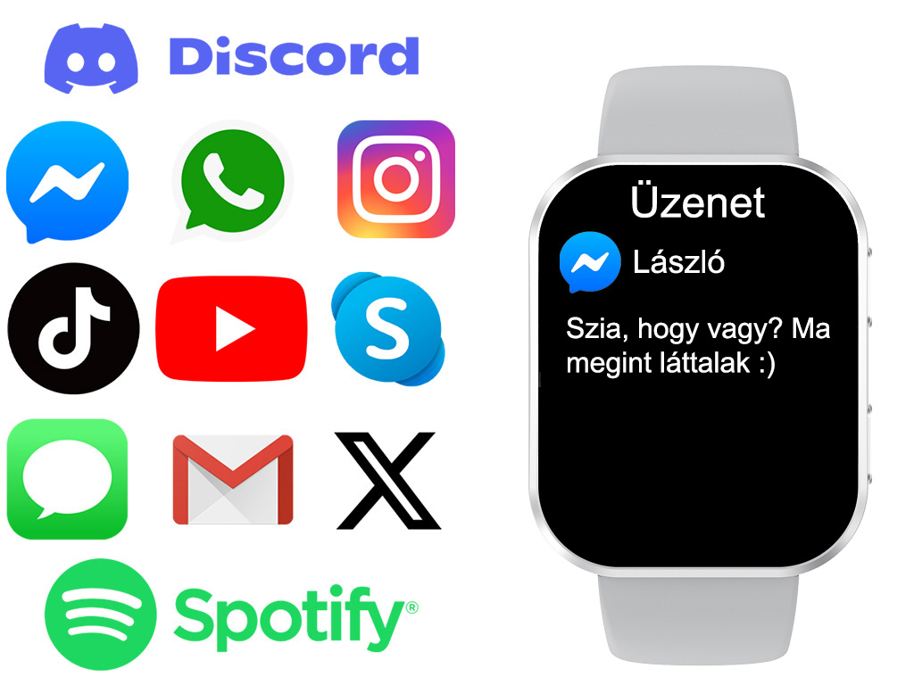 - Értesítések: bejövő hívások, SMS, alkalmazások (Facebook, Messenger, Instagram, TikTok, e-mailek és sok más…), női fiziológiai ciklus, folyadékbevitel.